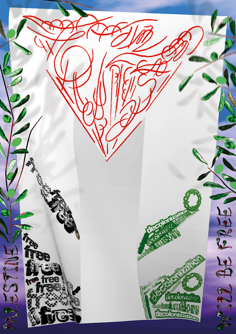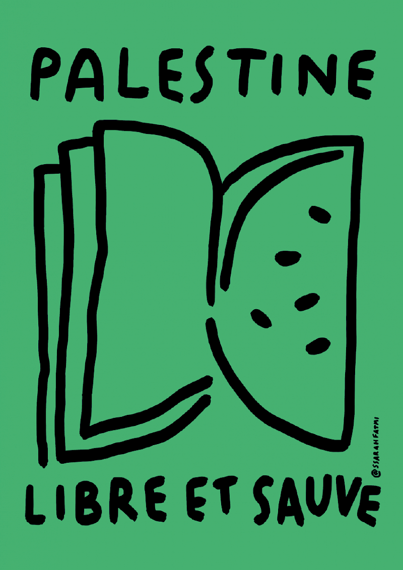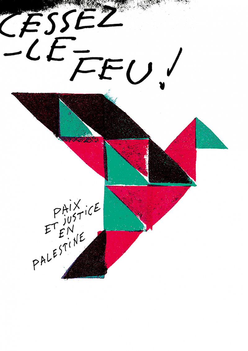 Pour participer, avec nos moyens de graphistes ou d’artistes visuel·les, à sensibiliser, alerter, informer sur le massacre en cours, afin d’y mettre fin au plus vite et de résoudre les causes profondes d’une situation intolérable, nous accueillons ici des images en soutien à Gaza et aux Palestinien·nes, qui peuvent être envoyées à formes.luttes@gmail.com (pdf ou psd A3 CMJN et/ou NB, 6 mm de fond perdu, pas de traits de coupe), et qui sont librement téléchargeables, diffusables et imprimables dans le cadre d’un usage militant et non-commercial.