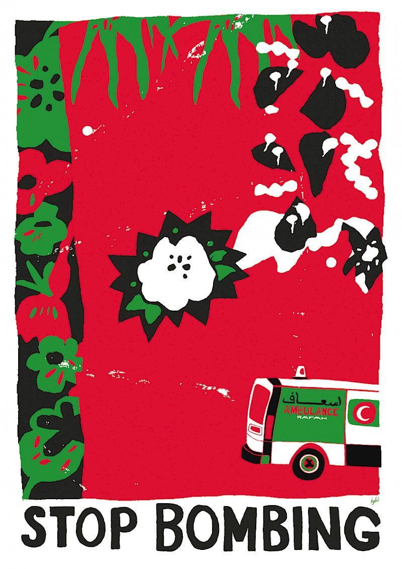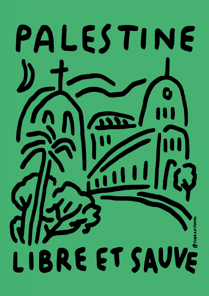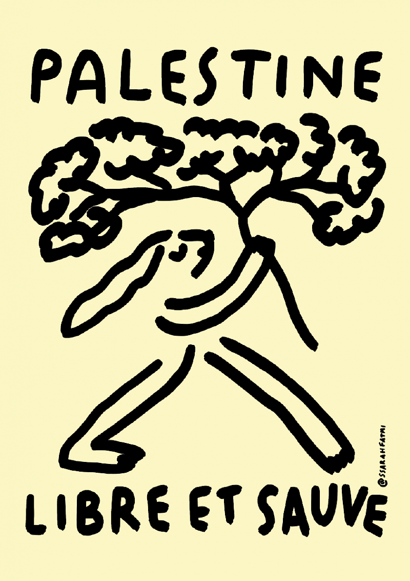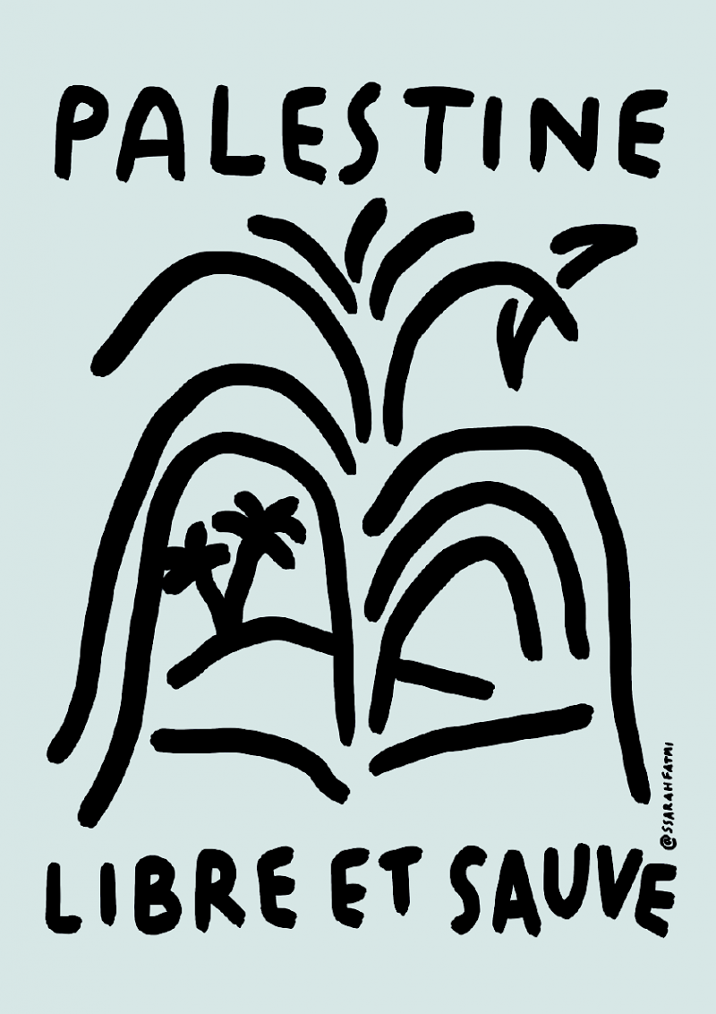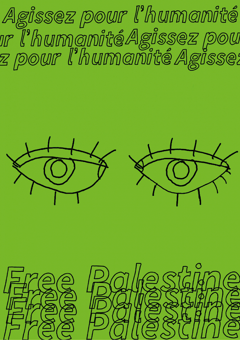 Pour participer, avec nos moyens de graphistes ou d’artistes visuel·les, à sensibiliser, alerter, informer sur le massacre en cours, afin d’y mettre fin au plus vite et de résoudre les causes profondes d’une situation intolérable, nous accueillons ici des images en soutien à Gaza et aux Palestinien·nes, qui peuvent être envoyées à formes.luttes@gmail.com (pdf ou psd A3 CMJN et/ou NB, 6 mm de fond perdu, pas de traits de coupe), et qui sont librement téléchargeables, diffusables et imprimables dans le cadre d’un usage militant et non-commercial.
