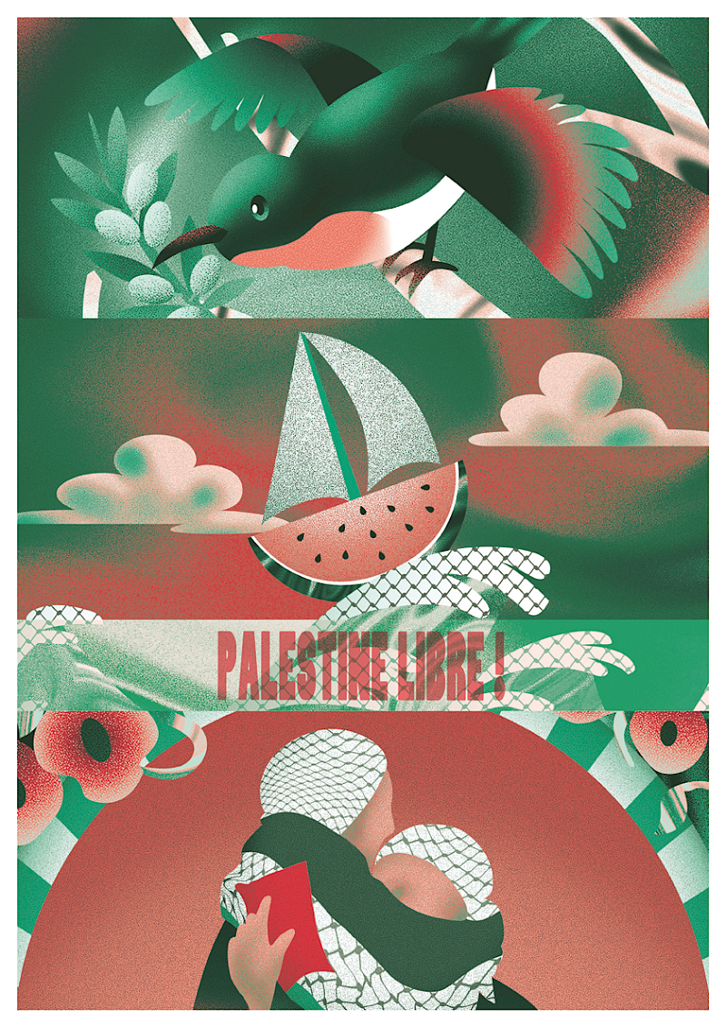 Pour participer, avec nos moyens de graphistes ou d’artistes visuel·les, à sensibiliser, alerter, informer sur le massacre en cours, afin d’y mettre fin au plus vite et de résoudre les causes profondes d’une situation intolérable, nous accueillons ici des images en soutien à Gaza et aux Palestinien·nes, qui peuvent être envoyées à formes.luttes@gmail.com (pdf ou psd A3 CMJN et/ou NB, 7 mm de fond perdu, pas de traits de coupe), et qui sont librement téléchargeables, diffusables et imprimables dans le cadre d’un usage militant et non-commercial.